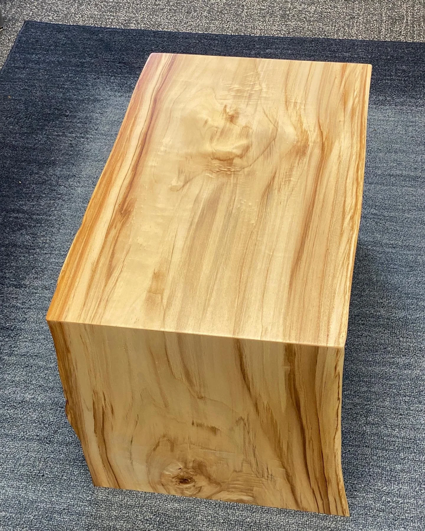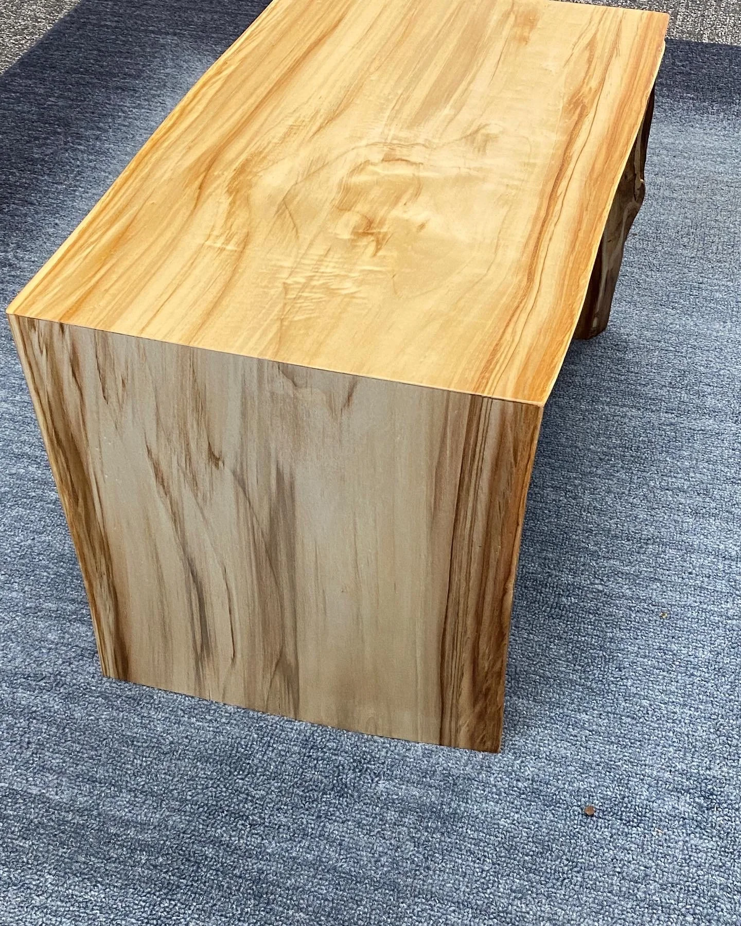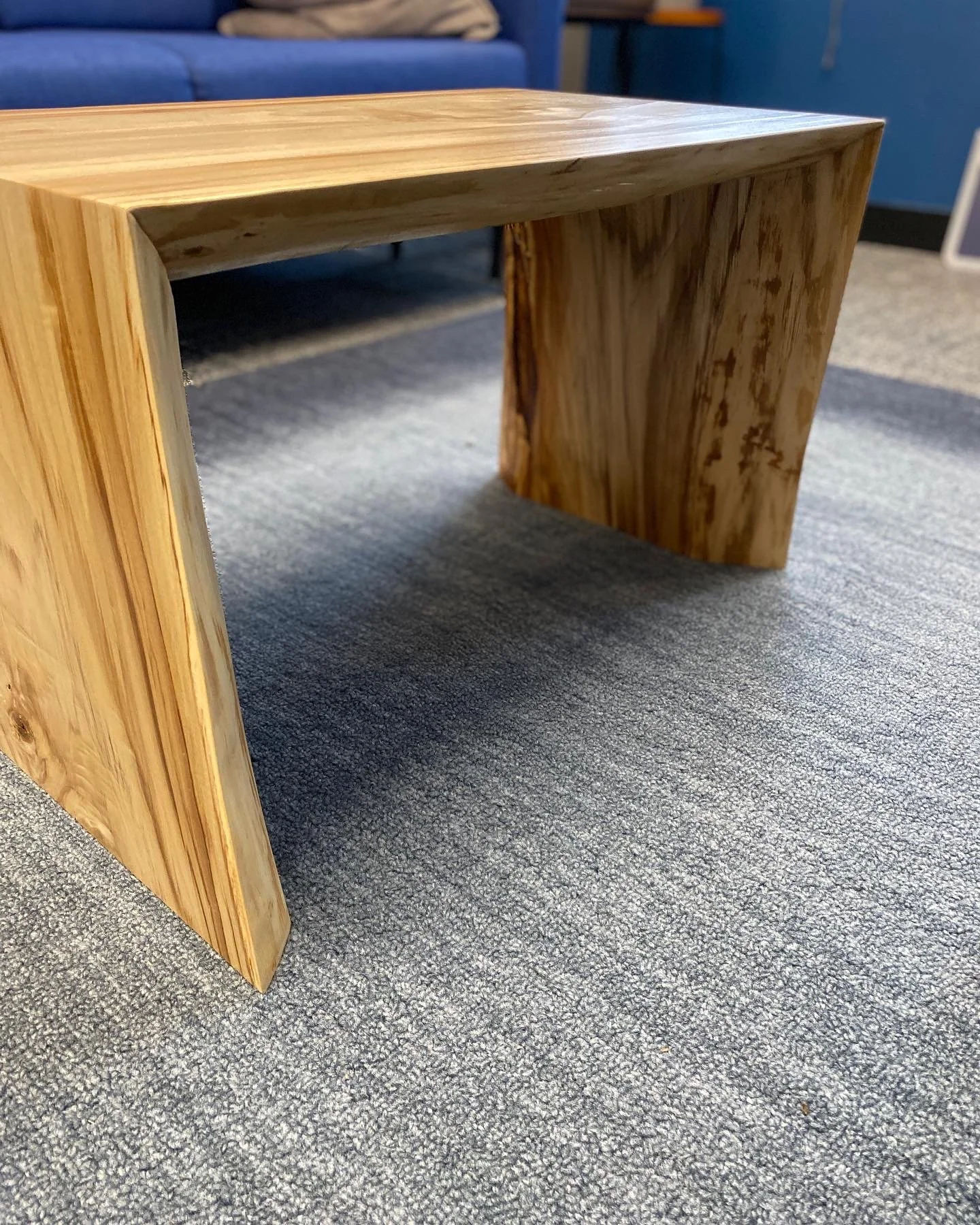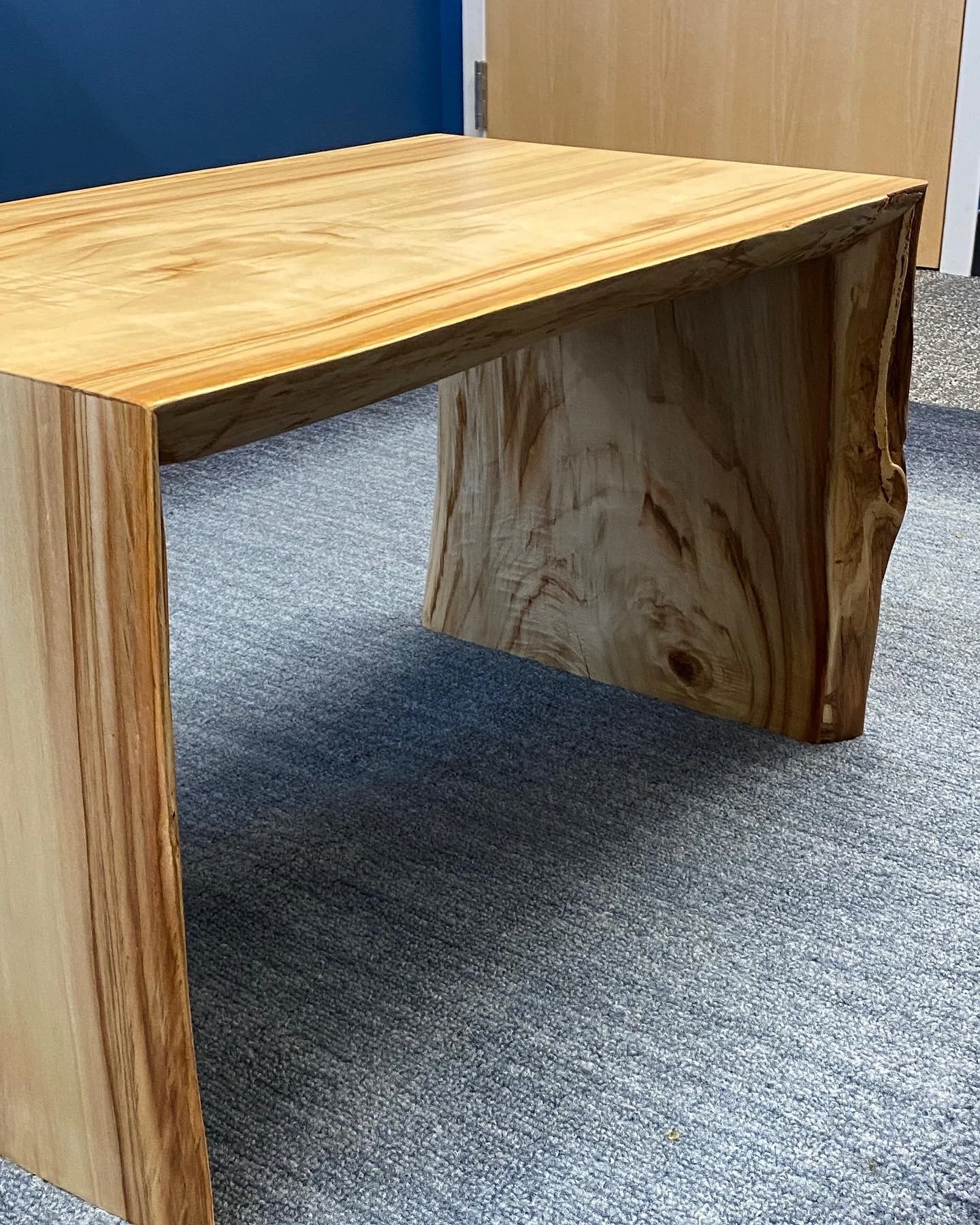 This was built for a small office and was made with American Elm. I bought the live edge slab from a local seller. The "waterfall" is due to the grain looking like it falls over the edge.