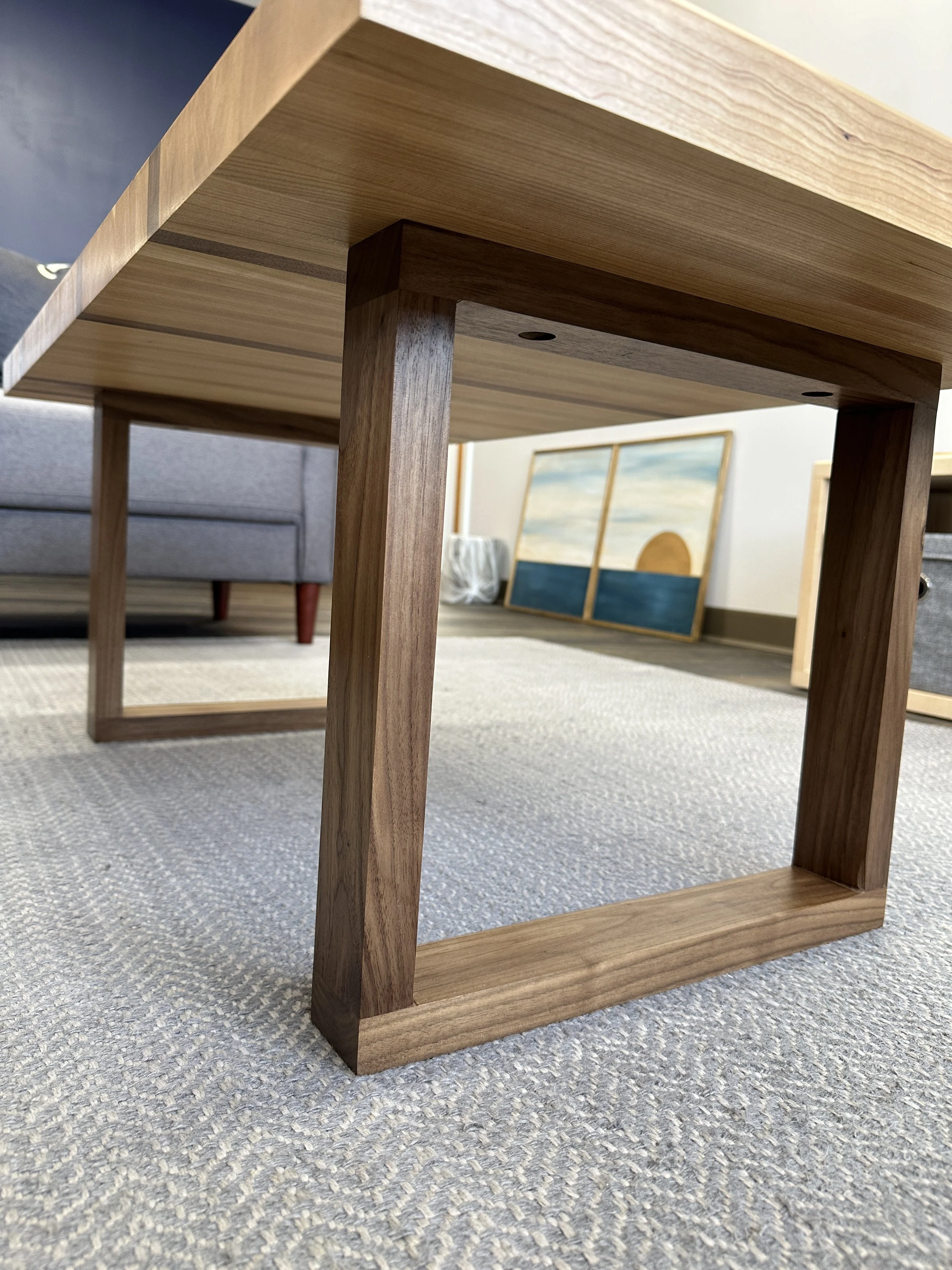 The legs were made of walnut with floating tenons in the joints. They are attached to the top with threaded inserts and flathead machine screws.