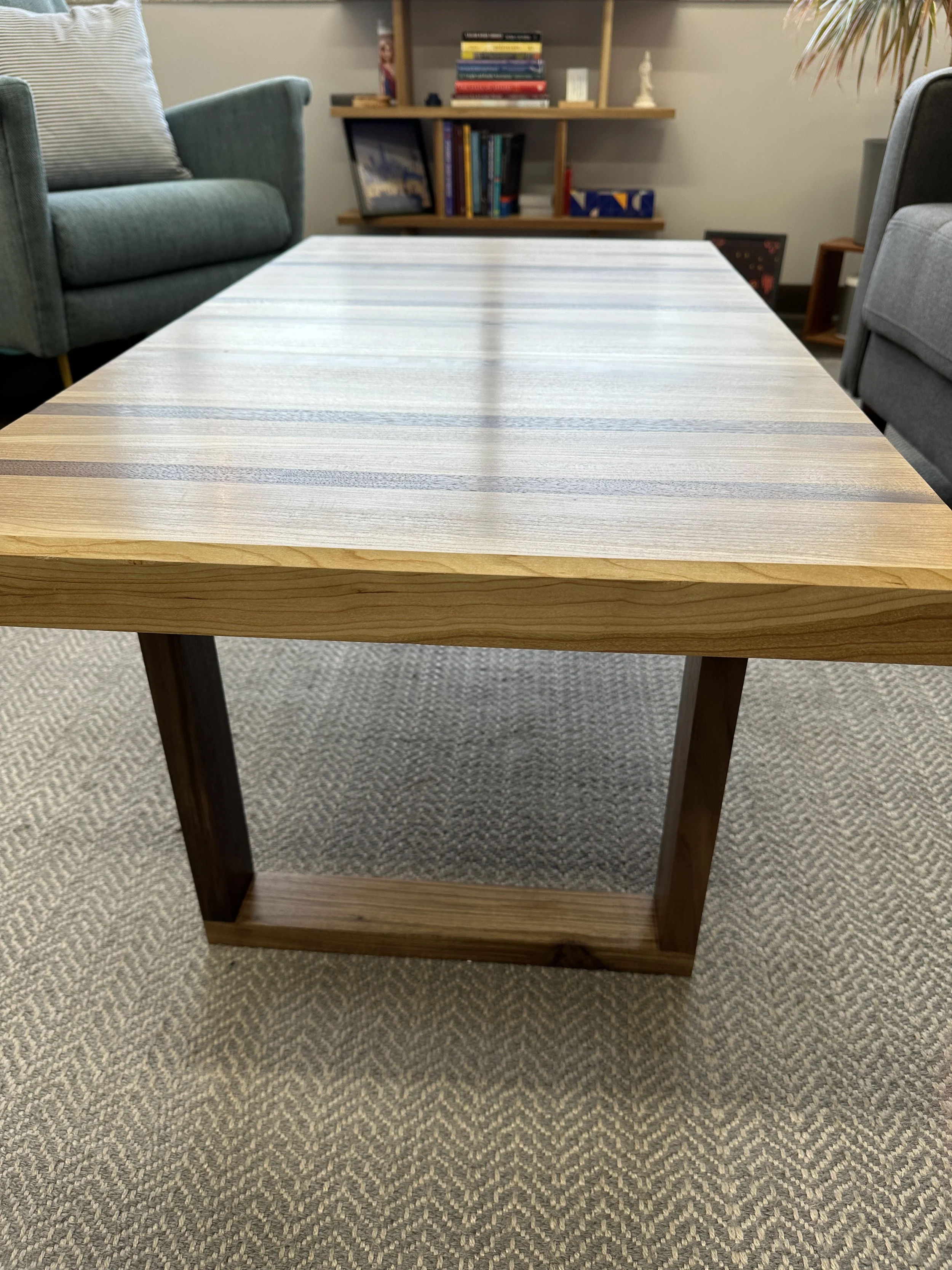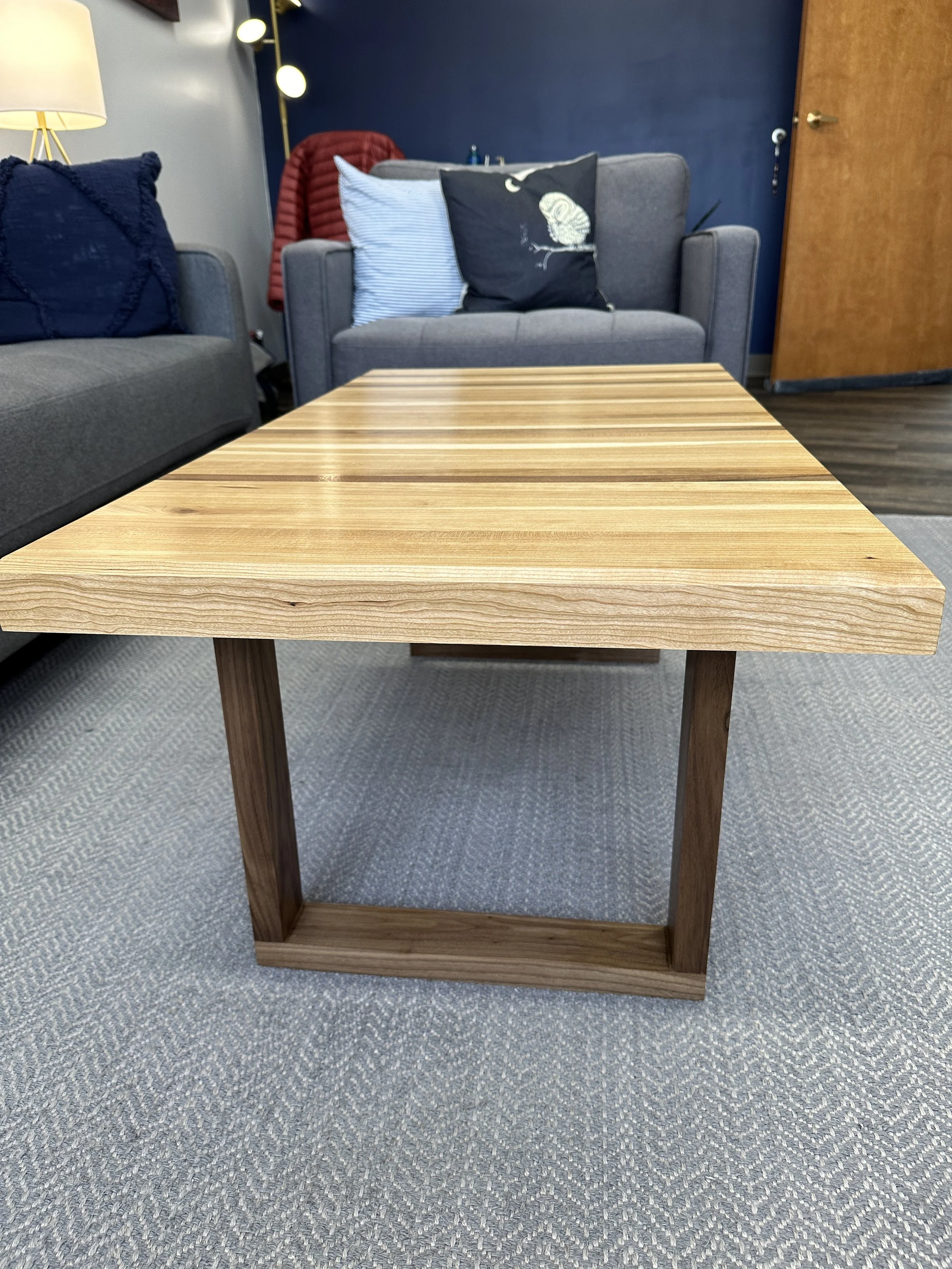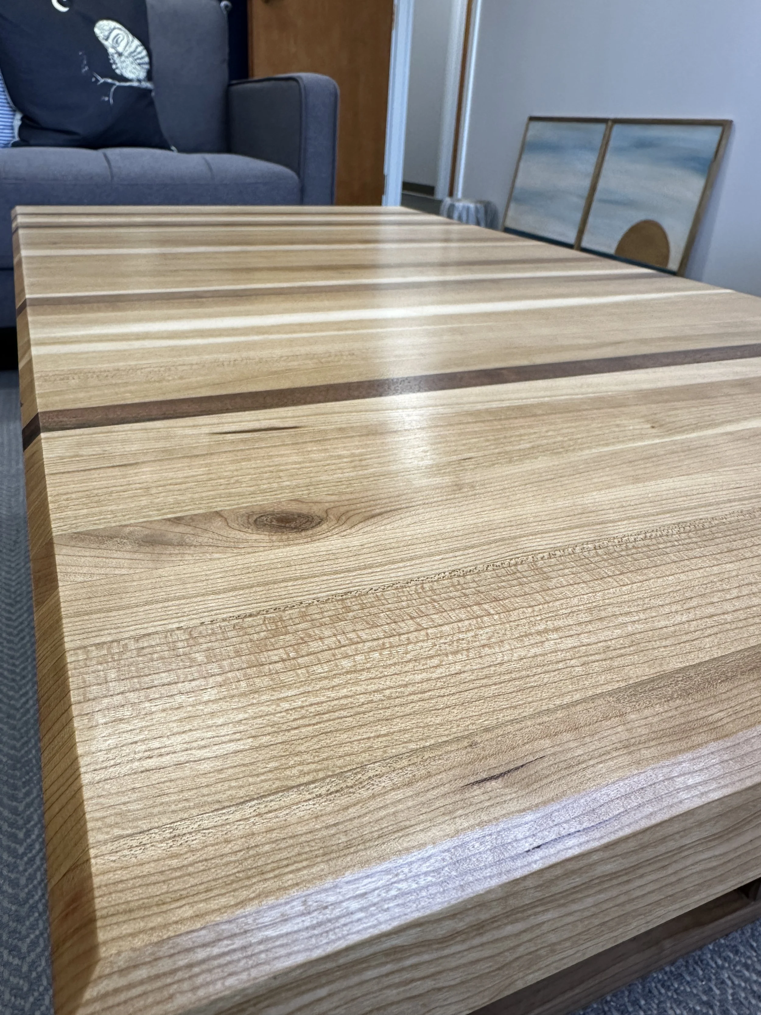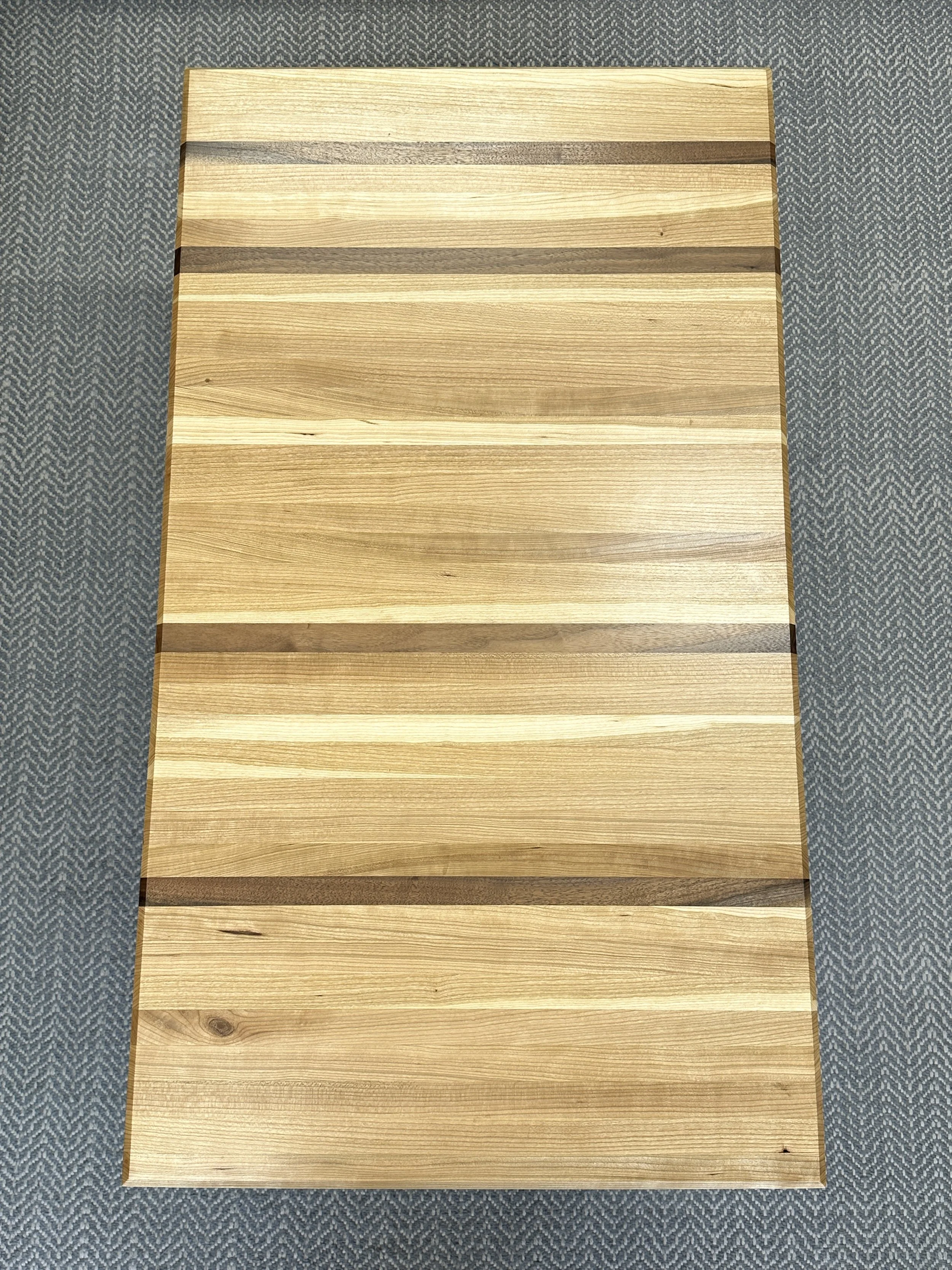 Made with black cherry and walnut. The walnut strips have been strategically placed to offer a touch of personalization. For example, as a fan of baseball, one of them is placed as the 9th strip from the end, representing both 9 innings and 9 players on a field. There are three more baseball references and a Taylor Swift reference.