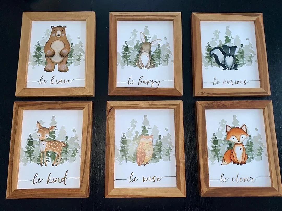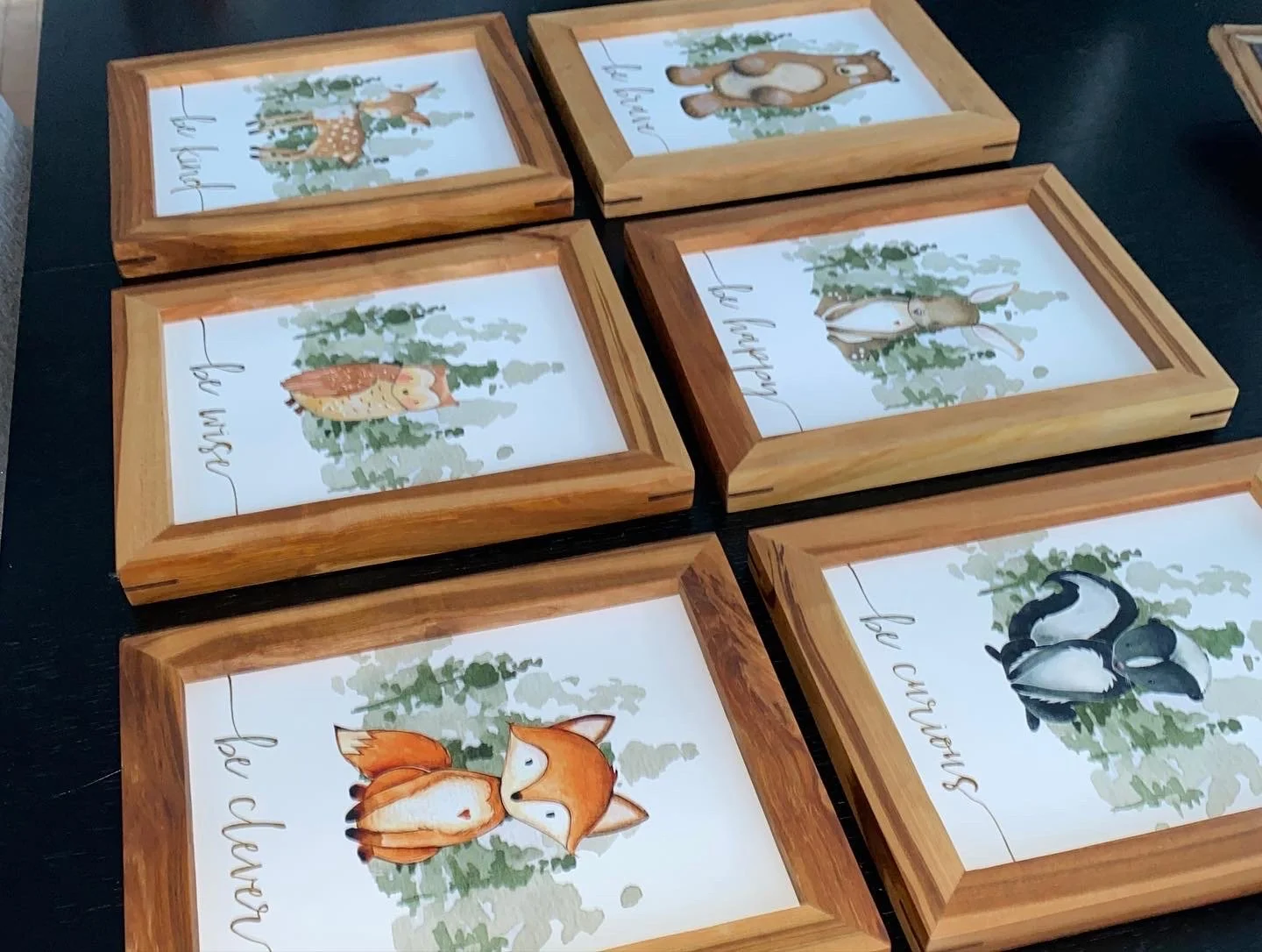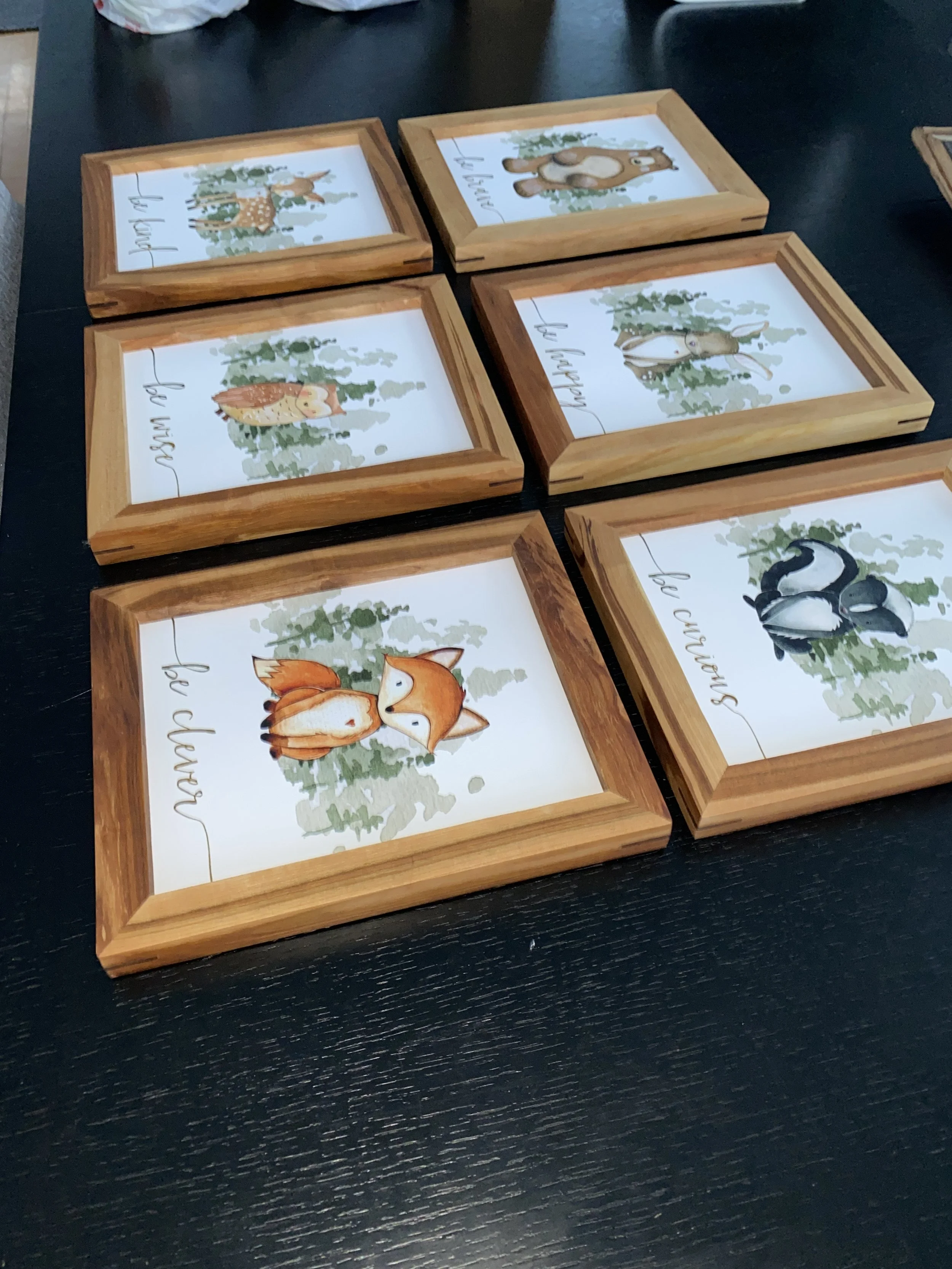 I made these for our kids' room. They are made of black cherry. I also added black walnut splines to each corner for extra durability, but mostly for the look. Since the pieces going into them were on cardstock I decided not to complicate it and did not do any glass. I was a bit worried, but they look great without glass.