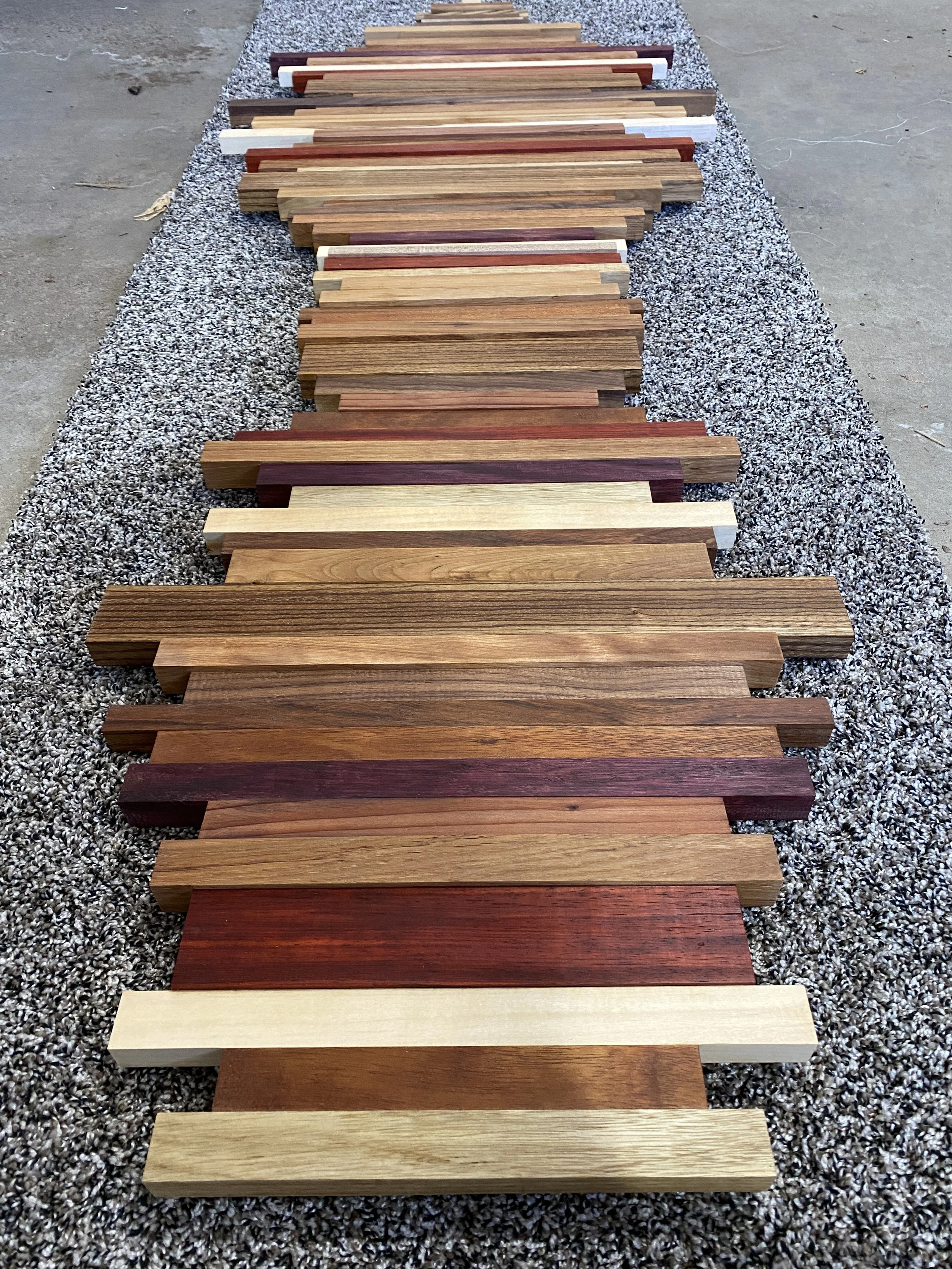 The wood species included are: maple, black walnut, black cherry, jatoba, hickory, zebrawood, purpleheart, limba, african mahogany, cedar, redwood, and ash.
